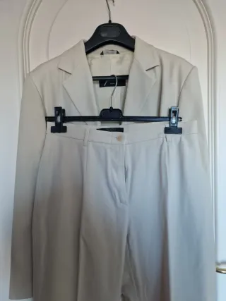 Elegante tailleur composto da giacca e pantaloni. - Giacca monopetto con chiusura a tre bottoni. - Tasche applicate sul davanti della giacca. - Pantaloni dal taglio dritto. - In ottimo stato