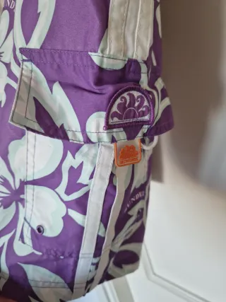 Bermuda Sundek con un vivace motivo floreale. - Unisex - Colore viola con fiori bianchi e azzurri. - Vita con laccio, bottone e velcro - Tasca laterale. - Usati pochissimo