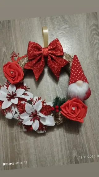 Bellissima ghirlanda decorata a tema natalizio, perfetta per aggiungere un tocco festivo alla tua casa. - Fiocco rosso glitterato. - Pupazzo gnomo con cappello a pois. - Fiori rossi e bianchi. - Elementi decorativi come pigne e rametti.