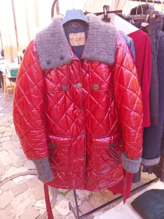 Elegante piumino trapuntato con un vivace color rosso bordeaux. - Collo in maglia grigia. - Chiusura con bottoni. - Tasche frontali. - Polsini in maglia grigia.