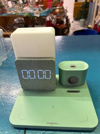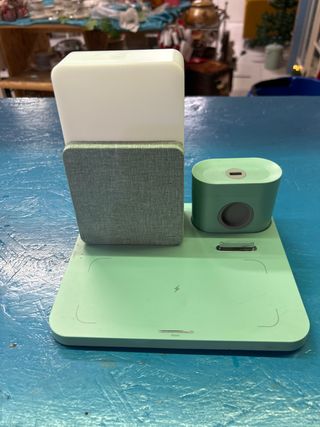 Stazione di ricarica wireless dal design moderno e funzionale, perfetta per organizzare i tuoi dispositivi. - Colore: verde menta. - Design compatto e salvaspazio. - Superficie di ricarica wireless. - Supporto integrato per dispositivi.