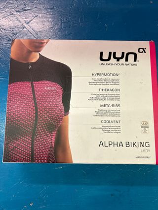 Maglia tecnica da ciclismo UYN, modello Alpha Biking per donna. Taglia XS - Tecnologia HYPERMOTION per maggiore libertà di movimento. - T-HEXAGON per regolare temperatura. - META-RIBS per stabilizzazione. - COOLVENT per ventilazione integrata. - Made in Italy.