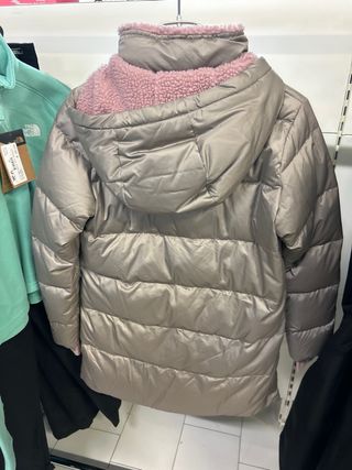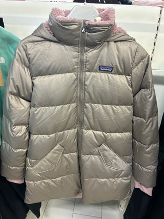 Giacca imbottita Patagonia con cappuccio e fodera in pile color rosa. - Tessuto esterno cangiante color oro. - Tasche frontali con bottone. - Polsini e orlo con dettagli rosa.