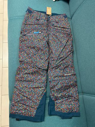 Pantaloni da sci Patagonia con una vivace fantasia. Taglia 7/8 anni - Fantasia a pois multicolore su fondo blu scuro. - Dettagli in tessuto blu. - Tasche con zip e bottoni.