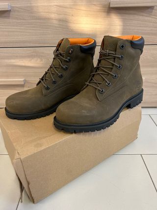 Scarponcini Timberland in pelle marrone con dettagli arancio. - Tomaia in pelle scamosciata. - Interno foderato in tessuto arancio. - Suola in gomma antiscivolo. - Chiusura con lacci.