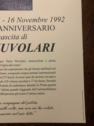 Stampa celebrativa del centenario della nascita di Tazio Nuvolari, pilota automobilistico. - Organizzato da San Quirico d'Orcia. - Tenutosi presso le Sale di Palazzo Chigi Zondadari. - Mese: Novembre 1993. - Periodo celebrato: 16 Novembre 1892 - 16 Novembre 1992. - Include un'immagine di Tazio Nuvolari.