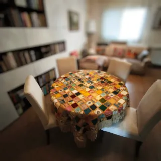 Grande, Elegante e Prestigioso Copritavolo realizzato in Patchwork con quadrati di vari tessuti di 7 cm., foderato e rifinito con passamaneria e frangia. Dimensione 140X140 più la frangia di 15 cm.