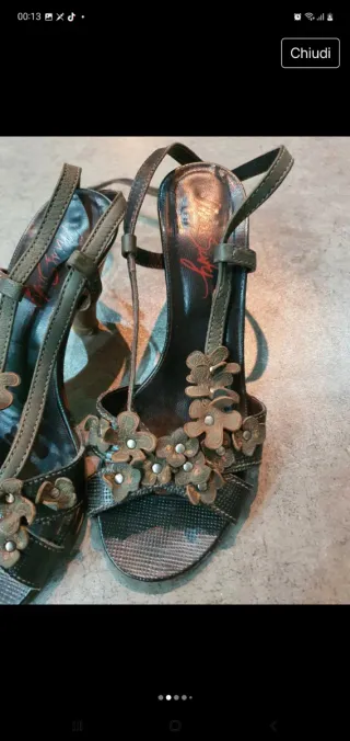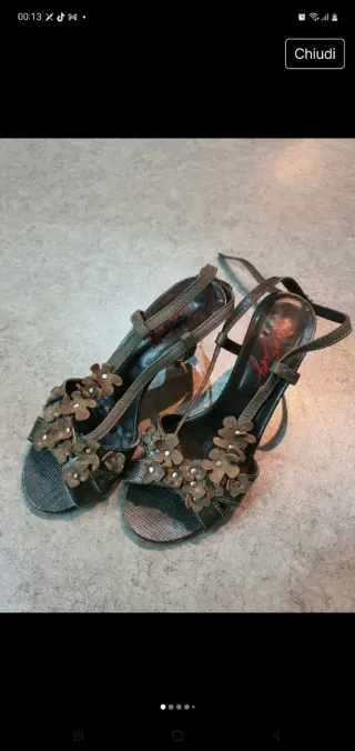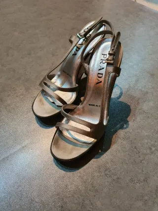 Eleganti sandali in pelle Prada,difetti in foto,il tacco ha un piccolo graffiolino e la soletta da una parte si è un pochino sollevata. Soletta interna 25cm - Materiale: Pelle - Colore: Oro/Argento