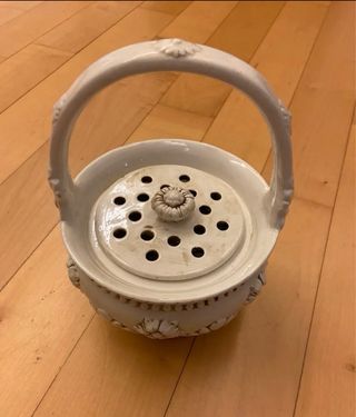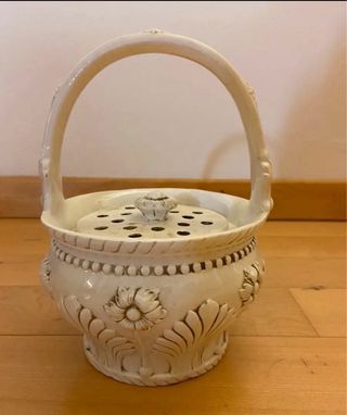 Vendo elegante porta fiori in ceramica bianca MADE IN ITALY anni ‘60, un pezzo d'epoca Richard Ginori, come nuovo!!!! - Design classico con decorazioni floreali. - Manico curvo per un facile trasporto. - Piatto interno forato per disporre i fiori.