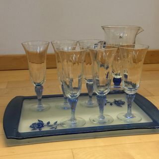 Vendo set composto da 6 calici in cristallo con caraffa e vassoio da cocktail NUOVO (mai usato). Interamente lavorato a mano e rigorosamente MADE IN ITALY della CRISTALLERIA ITALIANA. - Sei calici in vetro trasparente con dettagli blu. - Caraffa in vetro trasparente con manico e beccuccio. - Vassoio rettangolare con bordo blu e decorazione floreale.