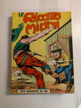 Vendo rarità per collezionisti: Tex Gigante numero 26, dal titolo "Il ricatto di Milton". Editore: Edizioni Araldo (Sergio Bonelli Editore). Prezzo in copertina: L. 200. Stato di conservazione: Buono/Ottimo. La costina è solida e ben leggibile (come da foto), le pagine interne sono complete e non presentano segni di biro o scotch. Leggero ingiallimento naturale della carta che ne attesta l'autenticità e l'epoca.