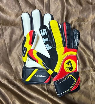Guanti da portiere professionali marca PTS. - Design bicolore rosso e giallo. - Polsino con chiusura a velcro. - Logo PTS sul palmo. - Scritta Professional sul dorso. - Scritta Contact sul polsino.
