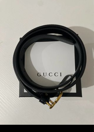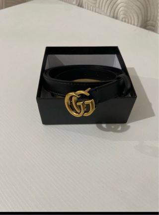 Cintura Gucci in pelle nera con fibbia dorata. - Design iconico con doppia G. - Finitura in oro. - Pelle morbida al tatto.