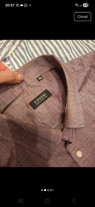 Lotto composto da tre camicie da uomo. - Camicia bordeaux a tinta unita. - Camicia a righe bianche e blu. - Camicia con microfantasia a pois rossi.