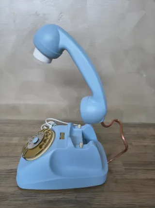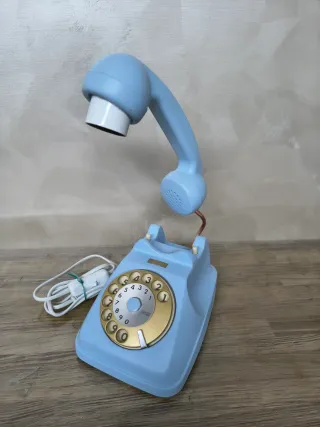 Un pezzo di design unico che unisce la funzionalità di una lampada all'estetica di un telefono vintage. - Design ispirato ai telefoni Sip. - Colore azzurro vivace. - Dettagli in oro sul disco combinatore. - Realizzato in materiale plastico resistente. Trattasi di un prodotto d'epoca restaurato. Non è quindi esclusa la presenza di piccoli difetti estetici.
