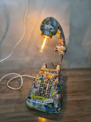 Originale lampada da tavolo creata da un telefono Sip vintage. Creato con tecnica del decoupage. Tema Topolino. - Design unico e creativo. Tema Topolino. - Decorato con fumetti. - Base in plastica. - Lampadina compresa nel prezzo