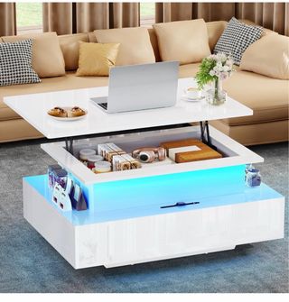 Elegante tavolino da caffè con un design moderno e funzionale. La superficie superiore si solleva per rivelare un pratico vano portaoggetti. - Vano portaoggetti interno. - Illuminazione LED integrata per creare atmosfera.