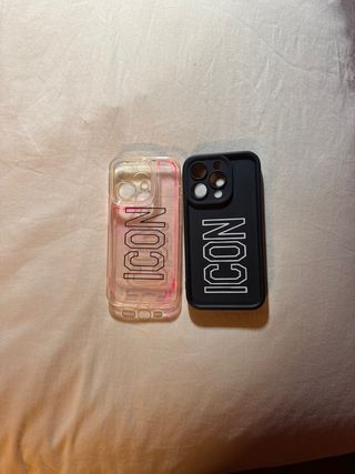Set di due cover per iPhone 15 Pro con logo ICON. - Cover trasparente con dettagli scritta nera ICON - Cover nera con logo ICON bianco.