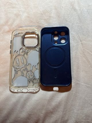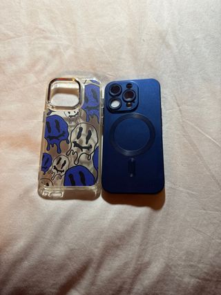 Set di due cover per iPhone 15 Pro. - Una cover trasparente con fantasia di fantasmi stilizzati blu e bianchi. - Una cover blu tinta unita.