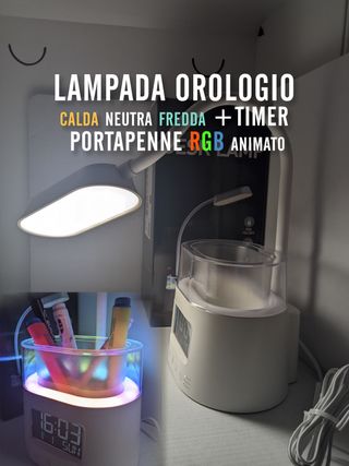 Lampada Orologio Portapenne Luce RGB calda fredda neutra dimmer timer flessibile NUOVO IN CONFEZIONE ORIGINALE Lampada da scrivania con orologio, portapenne luminoso RGB e collo snodabile. Luce forte bianca (calda, neutra, fredda) dimmerabile Touch Orologio digitale dimmerabile (da 0 a 100%) Portapenne con 3 modalità di luce RGB animata opzionale Batteria tampone per mantenere orario e configurazione luce Timer di spegnimento automatico 15/30/45 minuti ABS resistente, pesa circa 800 grammi Altezza massima circa 30cm Alimentazione con cavo, Manuale ed alimentatore incluso Ottima lampada moderna per lo studio e lettura