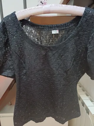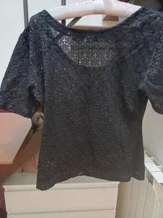 Top elegante con un delicato motivo floreale ricamato sul davanti, con perline nere e lurex argento. La scollatura è ampia e il tessuto è morbido, elasticizzato. Usato solo una volta.