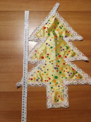 "Originale sacchetto a forma di albero di Natale, perfetto per regalini, dolciumi o come decorazione. Tessuto giallo satinato e brillante con vivaci pois multicolore. Contorno rifinito con pizzo bianco. Con possibilità di riempirlo. Cerniera non funzionante. Ideale per un Natale allegro e colorato! Le misure si trovano scorrendo le foto. #natale #alberonatale #pochette #sacchettoregalo #portadolci #pois #giallo #pizzo #decorazionenatale "