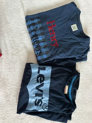 Set di due magliette per ragazzo. - Una maglietta blu scuro con logo Levi's grande sul davanti. - Una maglietta blu con scritta Henry rossa e dettaglio a quadri Cottons sul lato.