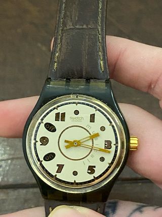 Orologio Swatch con cinturino in pelle marrone. - Quadrante color crema con numeri e indici. - Logo Swatch Swiss Made sul quadrante. - Lancette dorate.