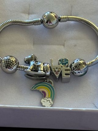 Bellissimo bracciale in argento con diversi charm. - Charm a forma di cuore con stelle azzurre. - Charm a forma di cubo colorato. - Charm pendente a forma di tartaruga con cristalli. - Charm tondo con decorazione a cuori. - Charm tondo con scritta ANIMAL KINGDOM. In acciaio inox