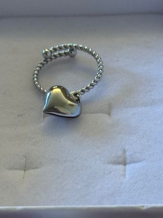 Anello con un ciondolo a forma di cuore sonaglio. Il design è elegante e moderno. - Ciondolo a forma di cuore lucido. - Fascia dell'anello a doppia torsione. - Chiusura regolabile per adattarsi a diverse misure.