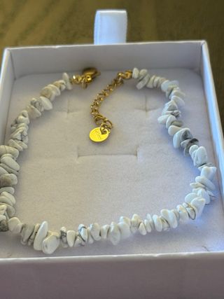 Elegante bracciale con pietre naturali bianche e dettagli dorati. Perfetto per aggiungere un tocco di stile. - Pietre irregolari bianche con venature grigie. - Chiusura e catenella regolabile in acciaio inox dorato. - Design unico e moderno.