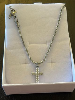 Elegante cavigliera con un ciondolo a forma di croce tempestato di strass. - Ciondolo a croce con strass. - Catena a maglia. - Chiusura a moschettone. In acciaio inox
