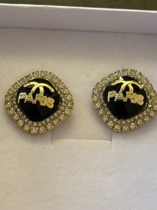 Eleganti orecchini con design a cuore e dettagli in oro. - Cornice tempestata di strass luminosi. - Logo CC e scritta PARIS dorati. - Finitura lucida in smalto nero. In acciaio inox