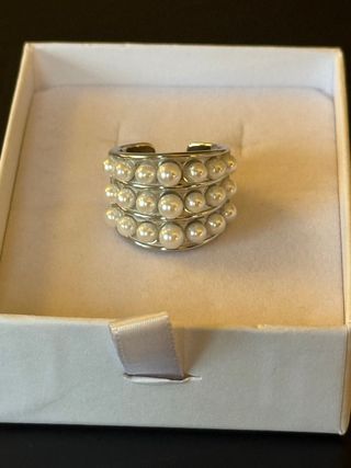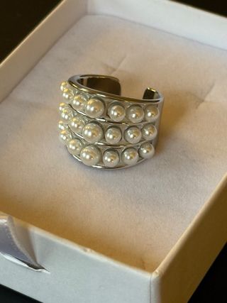 Elegante anello con perle. - Design a più file di perle. - Montatura in metallo color argento. - Misura regolabile per adattarsi a diverse dita. in acciaio inox