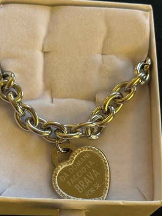 Elegante braccialetto con un ciondolo a forma di cuore, perfetto per aggiungere un tocco personale al tuo stile. - Ciondolo a cuore con incisione DA DOMANI FACCIO LA BRAVA FORSE... - Bordatura del ciondolo impreziosita da strass scintillanti - Maglie robuste e lucide In acciaio inox