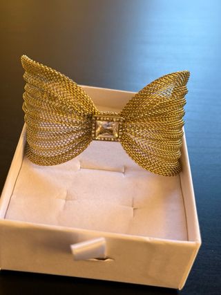 Elegante bracciale a forma di farfalla, perfetto per aggiungere un tocco di luce al tuo look. - Design a farfalla in maglia metallica. - Dettaglio centrale con cristallo luminoso. - Finitura color oro.