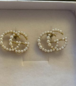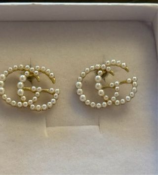 Eleganti orecchini a forma di doppia G, impreziositi da perle. - Design a doppia G. - Dettagli in perle. - Montatura color oro. In acciaio inox