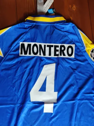Maglia da calcio della Juventus, Paolo Montero, prodotta da Kappa. Taglia XL. Misure dettagliate nelle foto allegate. - Colore blu con dettagli gialli. - Sponsor Sony. - Patch Scudetto e Coppa Italia. - Logo Kappa sul petto e sulle maniche. - Due stelle sopra lo stemma della squadra. Jersey. Nuova con cartellino.