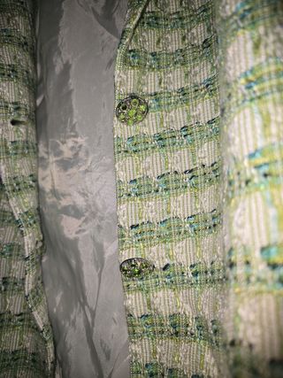 Elegante blazer con un motivo a scacchi. - Tessuto bouclé con fili metallici. - Fodera interna in raso. - Chiusura con bottoni.