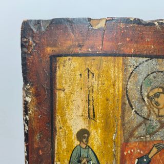 Antica Icona Russa Madonna "Gioia Inaspettata" - Prima metà del XIX Secolo - Tempera su Tavola. L'icona raffigura la Gioia inaspettata Nechayannaya Radost. Bipartita a Destra la Madonna con bambino con sotto scritta in cirillico e a sinistra il peccatore pentito. L'icona non presenta ridipinture. Presenta mancanze di colore (lacune) ai bordi ed in alcuni punti, coerenti con l'epoca e la natura del pezzo (si prega di visionare attentamente le foto). Il legno sul retro mostra la tipica lavorazione antica a sgorbia, shponki mancanti.ù Misure: 28 x 22.4 x 1.5 cm. antiquariato religioso religious antiques antiquités religieuses re