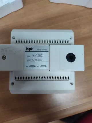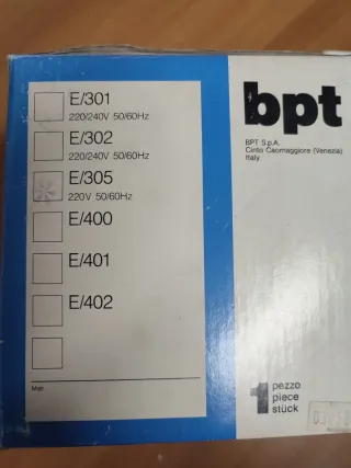 Alimentatore BPT modello E/301. - Tensione di alimentazione: 220/240V. - Frequenza: 50/60Hz. - Prodotto in Italia.