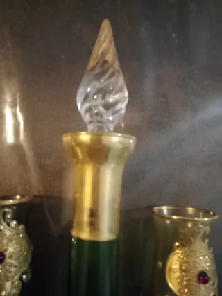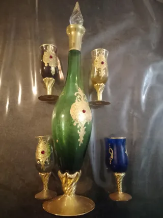 Elegante set composto da una bottiglia con tappo e quattro bicchierini. - Bottiglia in vetro verde con decorazioni dorate e inserti rossi. - Tappo in vetro trasparente con finiture dorate. - Quattro bicchierini con base dorata, decorazioni dorate e inserti rossi. - Un bicchierino di colore blu con decorazioni dorate.