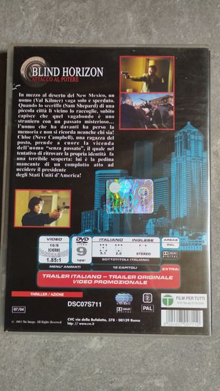 Film Blind Horizon - Attacco al Potere in formato DVD. - Val Kilmer, Neve Campbell, Sam Shepard, Faye Dunaway e Amy Smart nel cast. - Titolo originale: Blind Horizon. - Sottotitolo italiano: Attacco al Potere.