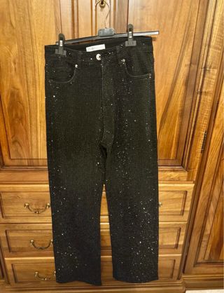 Jeans eleganti con una pioggia di brillantini che catturano la luce. - Tessuto nero. - Dettagli scintillanti su tutta la superficie. - Design classico a cinque tasche. Risulta taglia 40 ma va bene per chi porta la 44