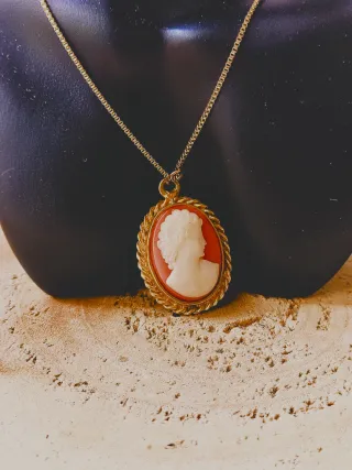 Elegante collana con ciondolo cammeo in stile vintage. Un gioiello raffinato che aggiunge un tocco di classe. - Ciondolo cammeo ovale con profilo. - Montatura con cordoncino dorato. - Catena sottile in maglia veneziana.