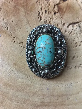 Bellissima spilla vintage con un design etnico e un'elegante pietra turchese. - Dettagli in argento lavorato. - Pietra centrale turchese con venature caratteristiche. - Stile unico e ricercato.