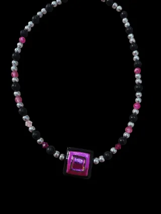 Collana vintage con un ciondolo centrale quadrato in vetro fucsia. - Perle nere e rosa. - Dettagli in metallo argentato.