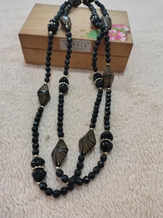 Elegante collana vintage, un accessorio che aggiunge un tocco di classe. - Perle sfaccettate nere. - Dettagli dorati. - Elementi decorativi a forma di rombo e sfere.