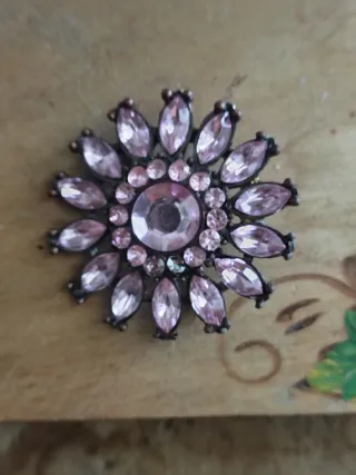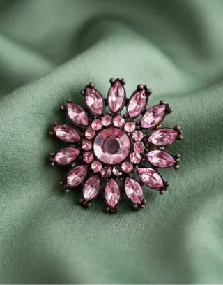 Spilla a forma di fiore con dettagli luminosi. - Design floreale vintage. - Pietre color rosa. - Montatura in metallo scuro.