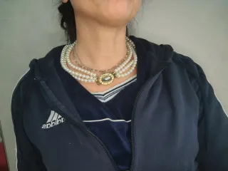 Elegante collana vintage a tre fili di perle. Finte - Dettagli in color oro. - Design a più fili.
